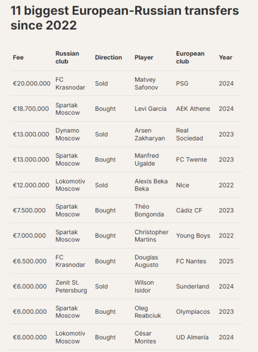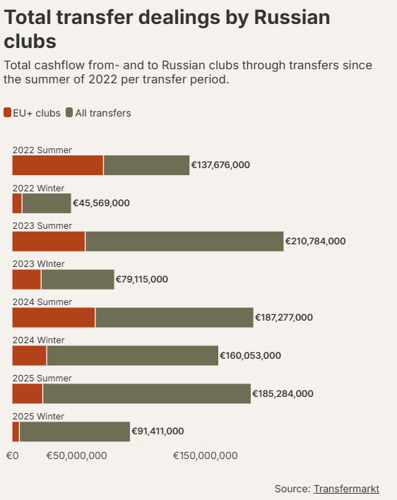 - European football clubs have done substantial transfer business with Russian sides since the full-scale invasion of Ukraine was launched in February 2022. More than €277 million in transfer fees has changed hands.