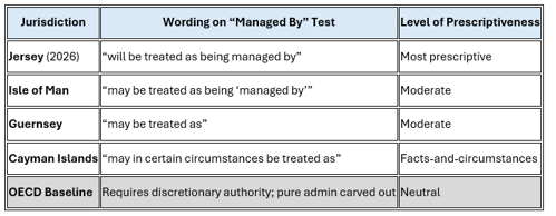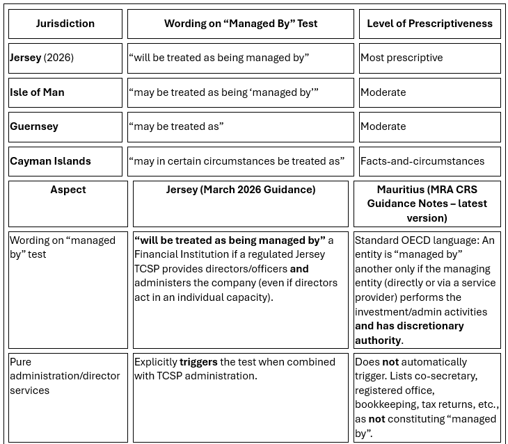 - Mauritius has not followed Jersey’s tightening. Its guidance remains unchanged in this area and continues to give TCSPs / management companies more room to argue that pure administration + director provision does not meet the “managed by” test.