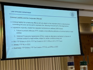 - Corporate Criminal Liability Update: Economic Crime & Corporate Transparency Act introduces senior manager liability. Compliance officers → potential corporate liability. Jersey DPA requires self-reporting, must meet evidence-based standards → necessary agreement on facts for entry into the DPA process.