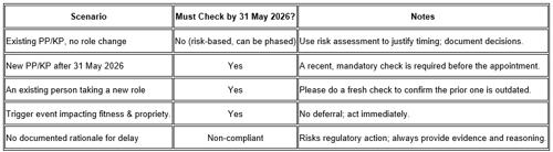 - For new appointments, new roles, or defined trigger events after 31 May 2026, the check is mandatory at that point and cannot be deferred.
