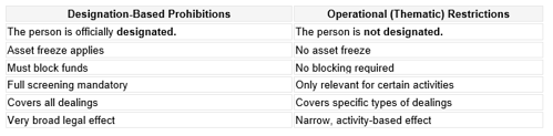 - Designation-based prohibitions freeze assets and ban dealing with a person;