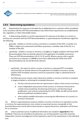 - Key factors for determining equivalence, as outlined in guidance from the JFSC's AML/CFT/CPF Handbook (Section 1.9.2 [Updated HB May 31, 2026), include:
