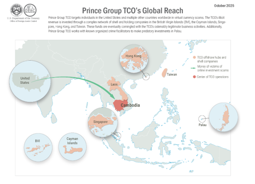 OFAC imposed sweeping sanctions on 146 individuals and entities tied to the Prince Group Transnational Criminal Organisation (TCO). These sanctions freeze any assets under U.S. jurisdiction and block access to the U.S. financial system. FinCEN also severed Huione Group—a central hub for laundering—from U.S. banking channels under Section 311 of the USA PATRIOT Act. [home.treasury.gov], [siliconangle.com] - Jurisdictions Involved: