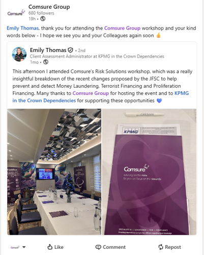 Comsure’s end-of-year AML training went really well, including a mid-afternoon mulled wine treat. And having feedback is always a nice present and makes me want to go again. So, watch this space for 2026