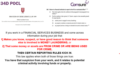 - In the context of that Jersey law on reporting suspicions in financial services (Article 34D of the Proceeds of Crime Law), both points describe situations that could trigger a need to report to your company's nominated officer (MLRO) or the Financial Intelligence Unit.