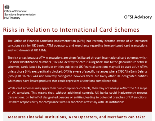 - You should be aware that the OFSI has issued in the past a card scheme warning, as shown below