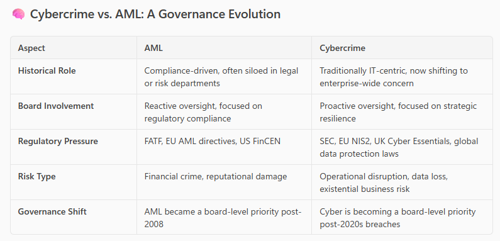 - Just as AML evolved from a niche compliance concern to a boardroom imperative, cybercrime is undergoing the same transformation but faster, and with broader implications.
