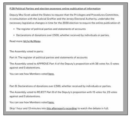 - Comments on Proposition P.28/2026 (Political Parties and Election Expenses: Online Publication of Information – the key document for Deputy Moz Scott's proposition): https://statesassembly.je/publications/comments/2026/p-28-2026-com