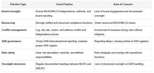 - Notable deficiencies included poor documentation of MLRO decisions, delays in SAR handling, lack of SAR register maintenance, and insufficient board-level acknowledgement of MLROs’ internal escalations. [comsuregroup.com]