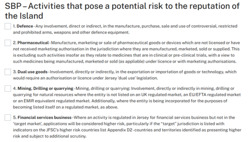 - The JFSC has significantly revised the list of activities that may pose a reputational risk to Jersey (formerly Table 2).