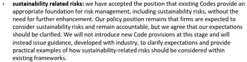- Many respondents felt that the current Code requirements for risk management already provided the basis for us to require sustainability risks to be addressed.