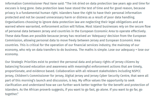 - Information Commissioner Paul Vane reinforced his office’s stance that enforcement action will be taken without delay or hesitation, where warranted and where risks to Islanders are identified.