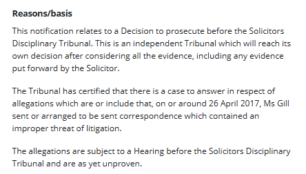 - Claire Gill, a partner at the firm, will face the Solicitors Disciplinary Tribunal over a letter sent in April 2017, which allegedly contained “an improper threat of litigation”,