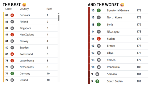 - This year’s CPI assessed 182 countries and territories, using 13 independent data sources to measure perceived levels of public‑sector corruption on a scale from 0 (highly corrupt) to 100 (very clean).