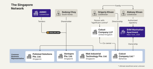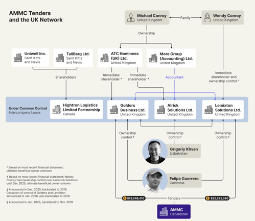 - The complex corporate structure [SEE BELOW] uncovered in this investigation centres on a network of foreign companies spanning the U.K., Georgia, Singapore, and offshore jurisdictions such as Nevis and the Bahamas that have collectively secured more than $200 million in tenders from Uzbekistan's state-owned Almalyk Mining-Metallurgical Complex (AMMC) since 2022.