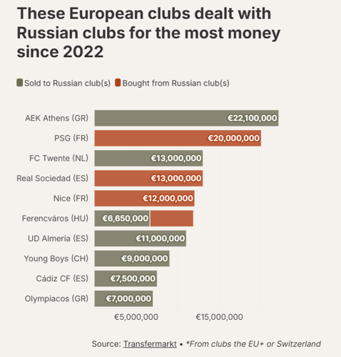 - European football clubs have done substantial transfer business with Russian sides since the full-scale invasion of Ukraine was launched in February 2022. More than €277 million in transfer fees has changed hands.