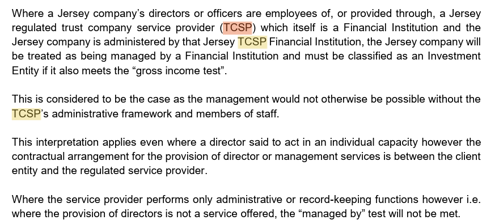 - Where a regulated Jersey TCSP provides directors/officers and administers a Jersey company, the entity will be treated as being managed by a Financial Institution. This applies even where the directors act in an individual capacity, provided the contractual arrangement for director or management services sits with the regulated TCSP.
