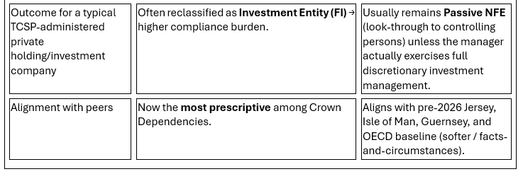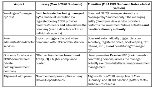 Yet this March CRS update does the opposite for a significant slice of TCSP-administered structures. While the Isle of Man and Guernsey still use the softer “may be treated as” language, Jersey has adopted the prescriptive “will be treated as”. Even more telling is the contrast with Mauritius. Following the March 2026 update, Mauritius has not followed Jersey’s tightening. Its latest CRS Guidance Notes still use the standard OECD facts-and-circumstances wording. Pure administration and director services provided by a Mauritius management company do not automatically trigger the “managed by” test. As a result, most private holding and family investment vehicles in Mauritius remain classified as Passive NFEs with a materially lower compliance burden than Jersey’s updated position.