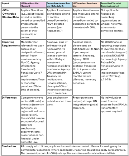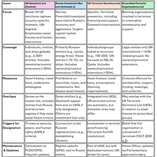 - Broad for UKSL, economic-focused for Russia, security-oriented for terrorism sanctions, and organisational bans for proscription.
