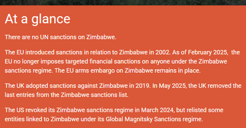 - The UK removed the last entries from its Zimbabwe sanctions list in May 2025, including four individuals and one entity (Zimbabwe Defence Industries). [gov.uk]