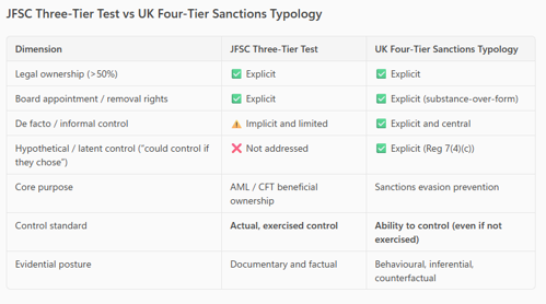 - UK Sanctions (Tier 2): Same legal limb but applied substantively; nominee/proxy arrangements, reserved matters and indirect powers are scrutinised (substance over form).
