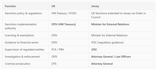 - Tension between Jersey and UK sanctions regulators, such as the OFSI, HMRC, FCA/PRA, the JFSC, and the Jersey Government
