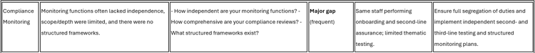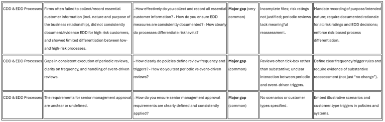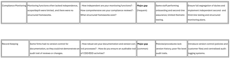 - While some good practices were identified (e.g., risk-based tailoring of CDD/EDD, clear documentation of EDD steps, independent thematic reviews, and detailed PEP controls), the review highlighted widespread weaknesses that we at COMSURE have observed for years.
