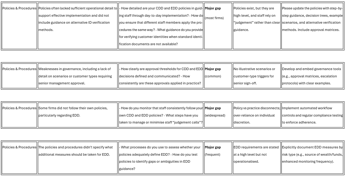 - Often lack sufficient operational detail and practical guidance (e.g., alternative ID verification methods, EDD measures, periodic/event-driven review triggers, senior management approval scenarios, and version control).