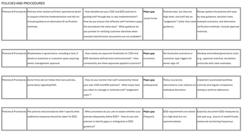 Key themes from the FCA (which align with the gap analysis below, Appendix 1) include: