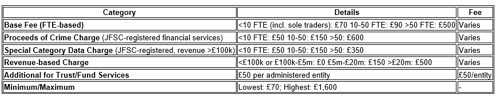 Fees are based on the Data Protection (Registration and Charges) (Jersey) Regulations 2018 and depend on full-time equivalent (FTE) employees, past-year revenue, JFSC registration status for financial services, processing of special category data, and additional charges for trust/fund services.