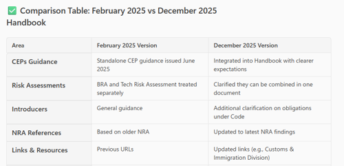 The Handbook is guidance, not law, but it explains how to comply with the AML/CFT Code 2019, which is legally binding. Key compliance points reinforced by the December 2025 update: