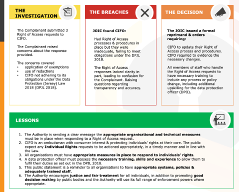 An individual (the Complainant) contacted the Authority in July 2024 to complain about the processing of their information by CIFO (the Channel Islands Financial Ombudsman), specifically in respect of the response provided to three data subject access requests (DSAR), which is the right to access your personal information.
