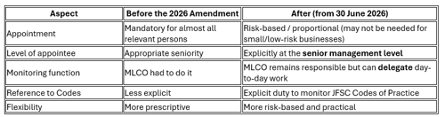 - → In practice, smaller or lower-risk businesses may now decide they do not need a dedicated MLCO (this is the big proportionality win the government consulted on).