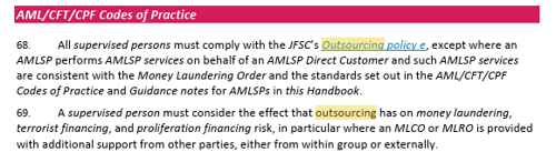 - Any outsourcing of material AML/CFT monitoring or compliance functions remains fully subject to the JFSC Outsourcing Policy.