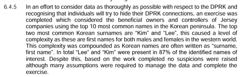 - The JFSCR undertook an exercise to identify the beneficial owners and controllers of Jersey companies using the top 10 most common names in the Korean peninsula.