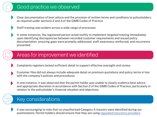 In the latter part of 2024 and early 2025, the JFSC conducted thematic assessment visits focusing on how general insurance mediation businesses (GIMBs) demonstrate due regard for their clients' interests, in line with Section 2 of the GIMB Code of Practice.