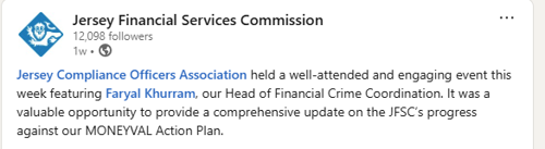 Faryal Khurram, THE JFSC Head of Financial Crime Coordination, provided a valuable and comprehensive update on the JFSC’s progress against our MONEYVAL action plan. Jersey Compliance Officers Association