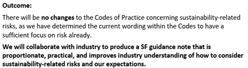 - Referring to sustainability specifically was therefore considered unnecessary and potentially detrimental to other risks posed to the industry.