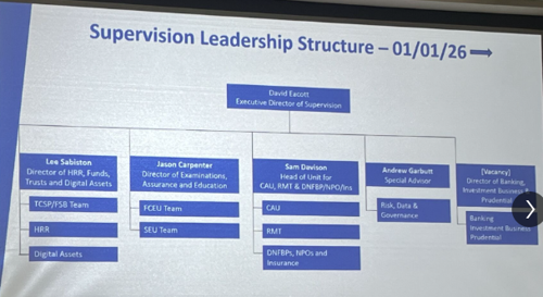- The JFSC has restructured its leadership with focused director roles, including dedicated oversight for digital assets, funds & trusts, examinations, and prudential supervision.