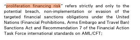 - “Proliferation financing risk” refers strictly and only to the potential breach, non-implementation or evasion of the targeted financial sanctions obligations under the United Nations (Financial Prohibitions, Arms Embargo and Travel Ban) Sanctions Act and Recommendation 7 of the Financial Action Task Force international standards on AML/CFT.
