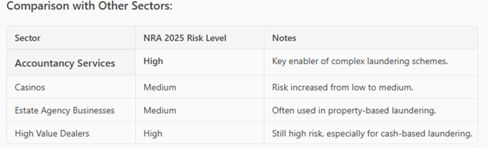 According to the UK National Risk Assessment 2025, the NRA identifies professional enablers—including accountants—as a high-risk sector due to their ability to facilitate complex financial transactions, create corporate structures, and conceal beneficial ownership.
