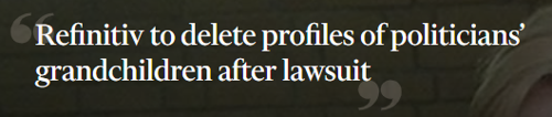 - Financial Times – Refinitiv to delete profiles of politicians’ grandchildren after lawsuit https://www.ft.com/content/41b57166-e631-4587-962d-18a031a6b997