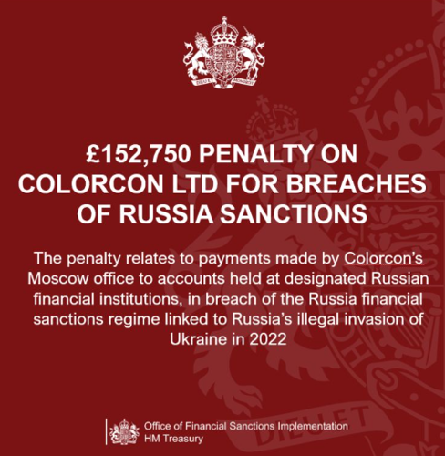 The Office of Financial Sanctions Implementation (OFSI) has issued a monetary penalty of £152,750 on Colorcon Limited, a pharmaceutical industry supplier and UK-registered subsidiary of Colorcon Inc.