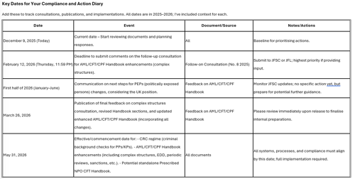 - Action: Begin planning resource allocation for system/process updates, staff training, and record-keeping enhancements. For CRCs, ensure mechanisms to obtain certified copies within six months of relevant events. For Handbook changes, focus on risk-based approaches (e.g., proportionality in EDD for PEPs/close associates and complex structures).