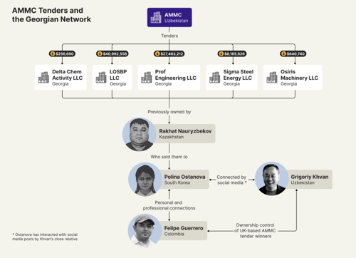- a network of opaque foreign companies that secured over $200 million in tenders from Uzbekistan's state-owned Almalyk Mining-Metallurgical Complex (AMMC) since 2022.