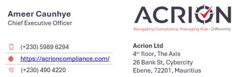 Acrion Ltd, 4th floor, The Axis, 26 Bank St, Cybercity, Ebene, 72201, Mauritius - https://acrioncompliance.com/