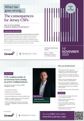 Join fellow CSPs and other professionals for an exclusive breakfast seminar co-hosted by Comsure and Trident Tax: "When Tax Goes Wrong... The Consequences for Jersey CSPs"
